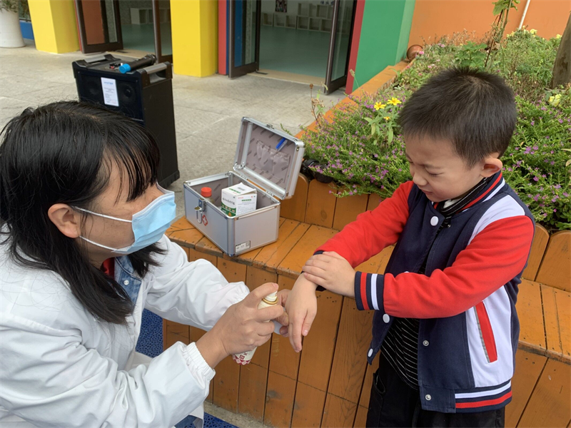 演练开始,当警报响起各班教师迅速停止课堂活动,有序指导幼儿躲在坚固的家具旁(生命三角区)或坚固的桌子下,尽量蜷曲身体,降低身体重心,尽可能保护头部和眼睛等身体重要部位。室内紧急避险结束后,为防止有较大余震发生,在第二次警报拉响后,全体教师立刻带领幼儿按指定疏散路线逃生。撤离到户外操场后,各班教师第一时间清点人数,对情绪激动的幼儿进行及时安抚,确保所有幼儿都安全撤离。同时,保健医生还实操模拟向全体师幼讲解急救过程及注意事项,提醒大家对“伤员”进行初步急救处理后,要及时拨打120急救电话,等待医院救护车送往医院。