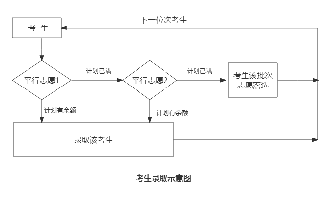 以普通高中第一批次平行志愿投档为例,如果某位考生的成绩位次是100,需前面99位考生检索完成后才轮到这位考生。考生录取流程示意图如下: